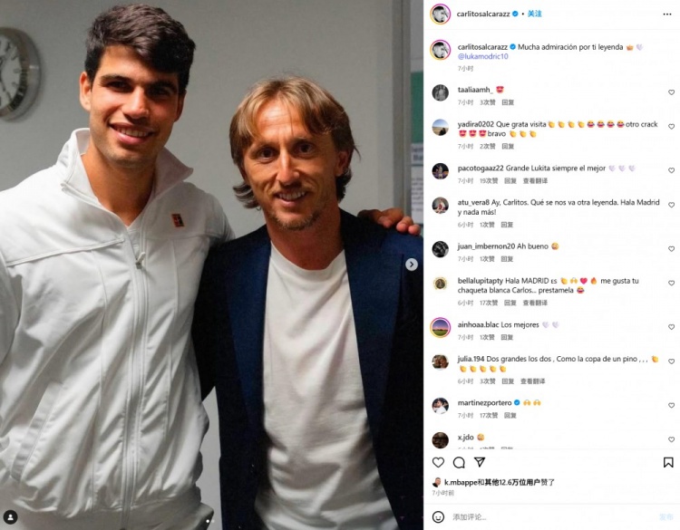 作为皇马的忠实粉丝,阿尔卡拉斯晒出两人合照,并配文写道:我非常敬佩你,你是真正的传奇。